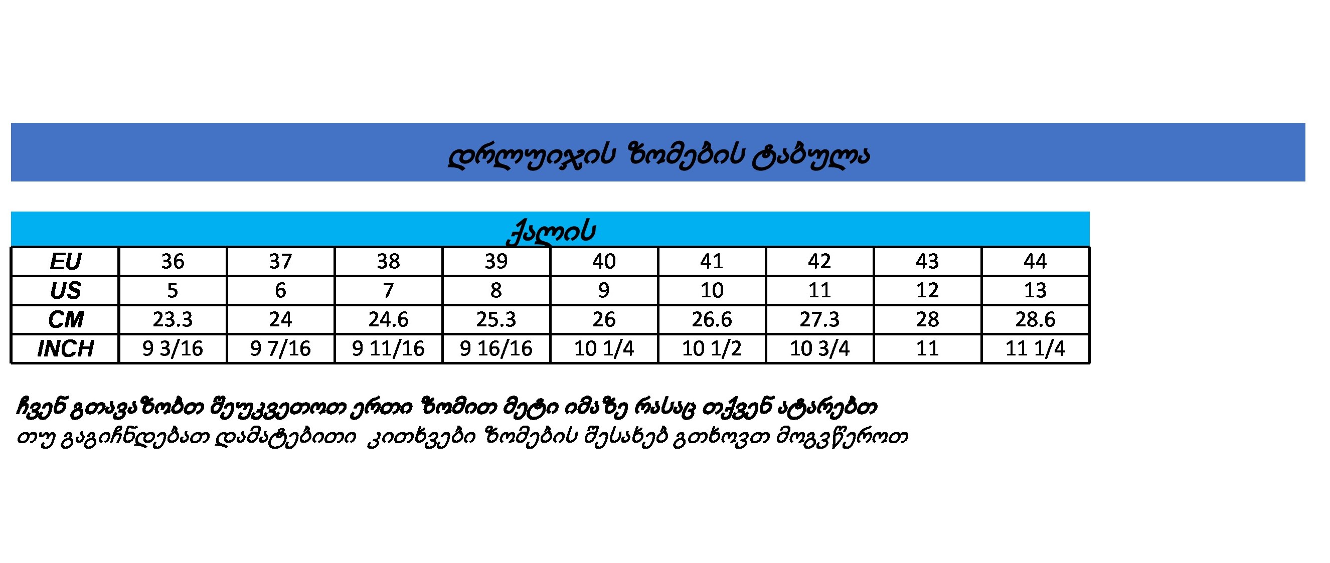 ზომები: 36, 37, 38, 39, 40, 41, 42 , 43 , 44